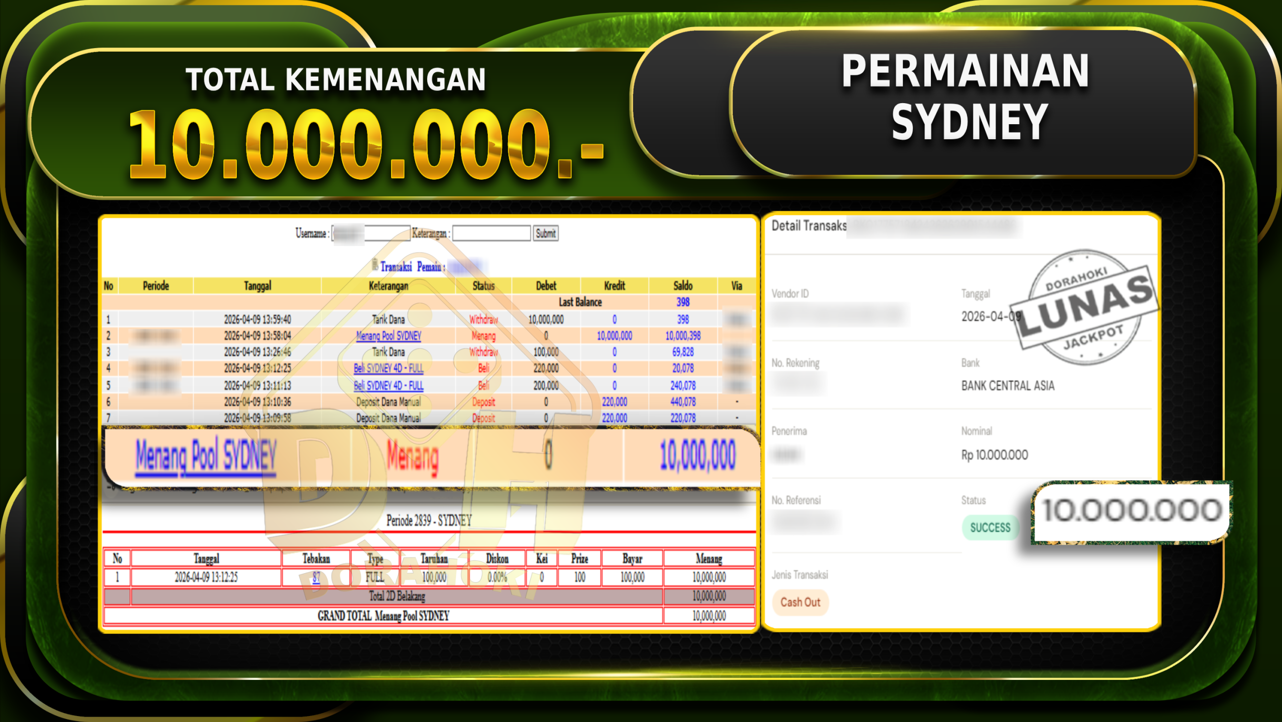 Bukti JP TOGEL SYDNEY – Selamat Kepada User ID : Venxxx atas kemenangan TOGEL SYDNEY Dengan Nominal Sebesar Rp 10.000.000,- . Yang pasti nya langsung LUNAS Sesuai Bukti.