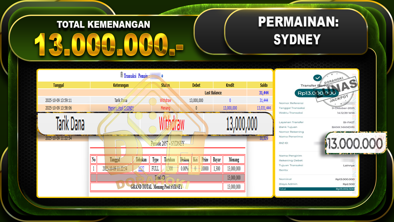 Bukti JP TOGEL SYDNEY – ucapkan selamat kepada user id artxxxxx atas kemenangan di TOGEL SYDNEY dengan total kemenangan Rp.13,000,000,- Yang pasti nya langsung LUNAS sesuai bukti ya bosku. Dorahoki nih bosku berapapun akan tetap kami bayar lunas ya bosku