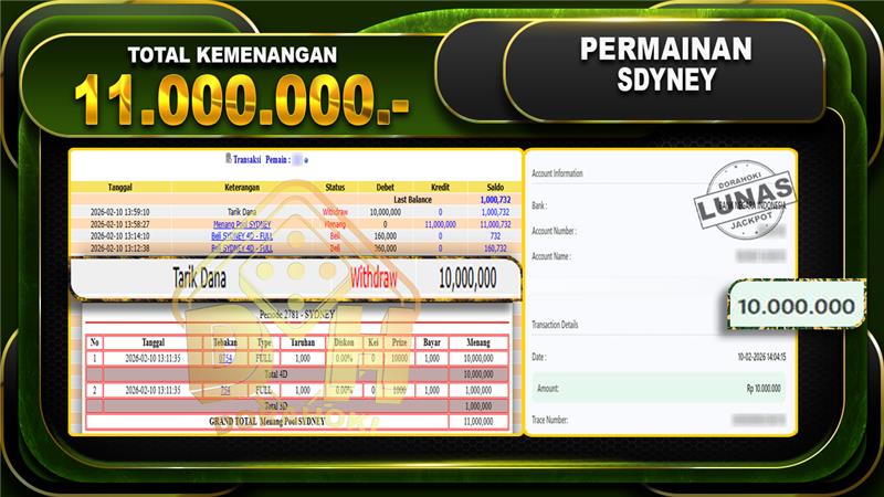 Bukti JP TOGEL SYDNEY – Selamat Kepada User ID : otxxx atas kemenangan TOGEL SYDNEY Dengan Nominal Sebesar Rp 11.000.000,- . Yang pasti nya langsung LUNAS Sesuai Bukti.