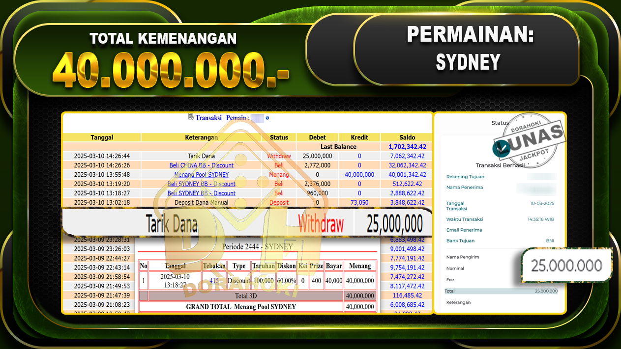 Bukti JP TOGEL SYDNEY – ucapkan selamat kepada user id Jitxxx atas kemenangan di  TOGEL SYDNEY  dengan total kemenangan Rp.40.000.000,- . Yang pasti nya langsung LUNAS sesuai bukti ya bosku. Dorahoki nih bosku berapapun akan tetap kami bayar lunas ya bosku.