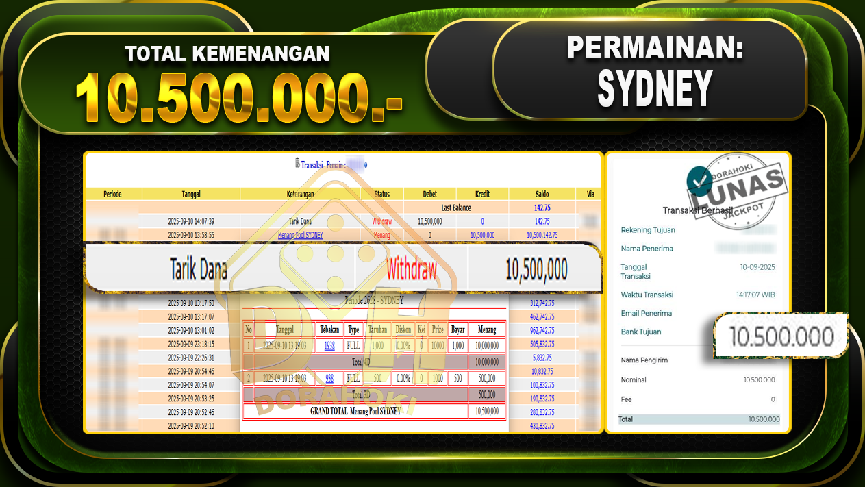 Bukti JP TOGEL SYDNEY – ucapkan selamat kepada user id Detxxxx atas kemenangan di TOGEL SYDNEY dengan total kemenangan Rp.10,500,000,- Yang pasti nya langsung LUNAS sesuai bukti ya bosku. Dorahoki nih bosku berapapun akan tetap kami bayar lunas ya bosku