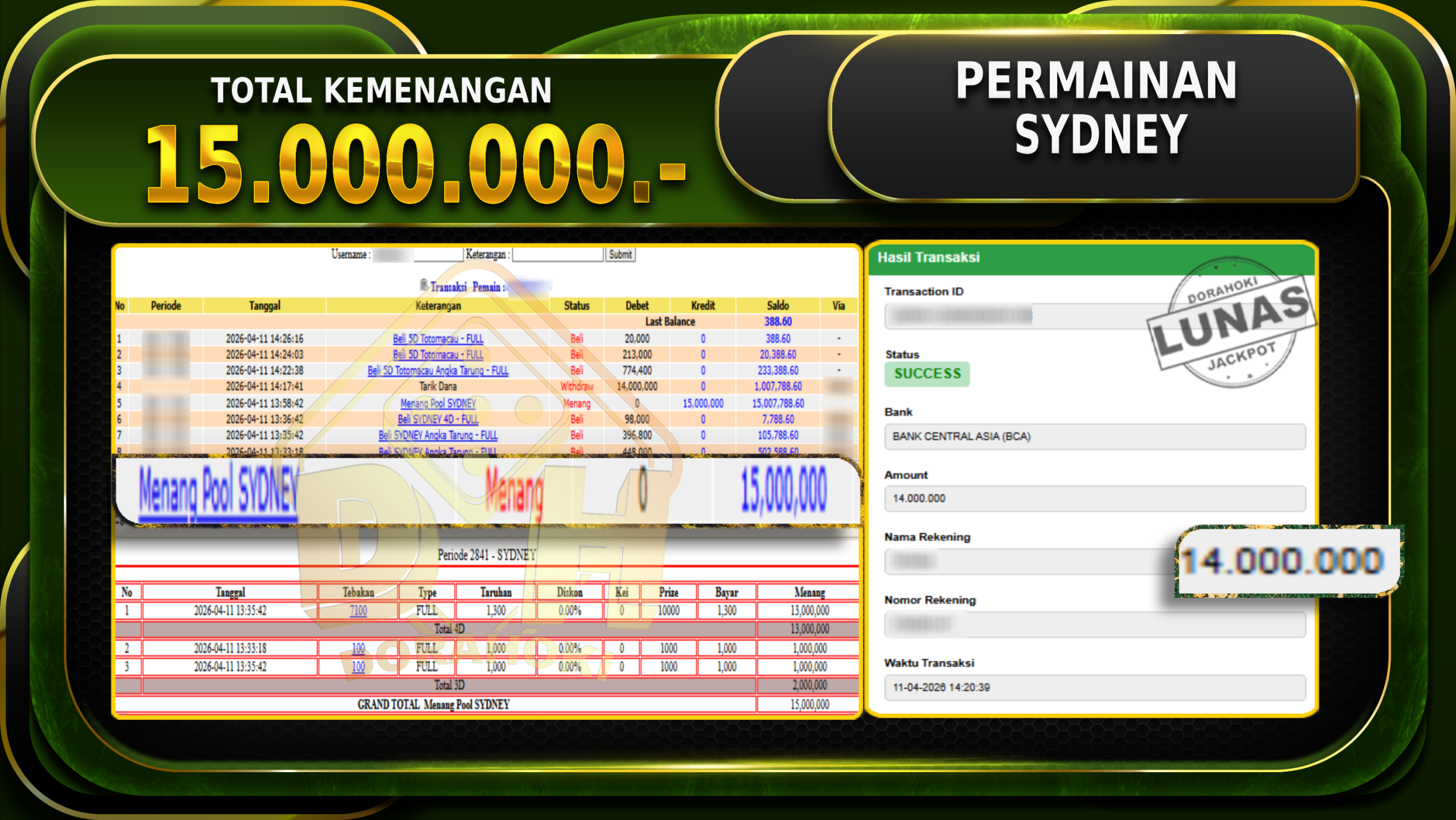 Bukti JP TOGEL SYDNEY – Selamat Kepada User ID : Adixxx atas kemenangan TOGEL SYDNEY Dengan Nominal Sebesar Rp 15.000.000,- . Yang pasti nya langsung LUNAS Sesuai Bukti.