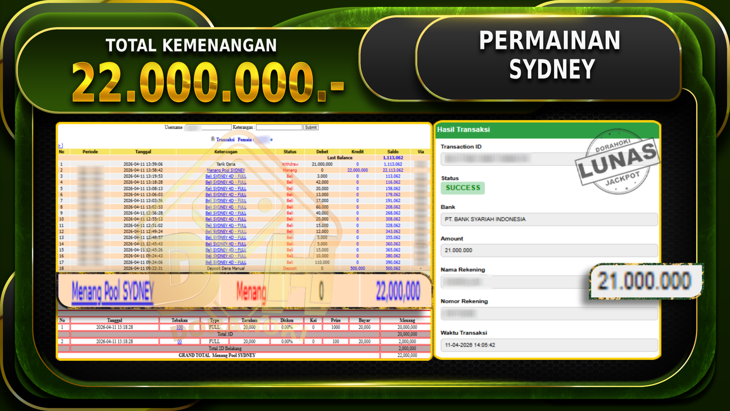 Bukti JP TOGEL SYDNEY – Selamat Kepada User ID : Aroxxx atas kemenangan TOGEL SYDNEY Dengan Nominal Sebesar Rp 22.000.000,- . Yang pasti nya langsung LUNAS Sesuai Bukti.