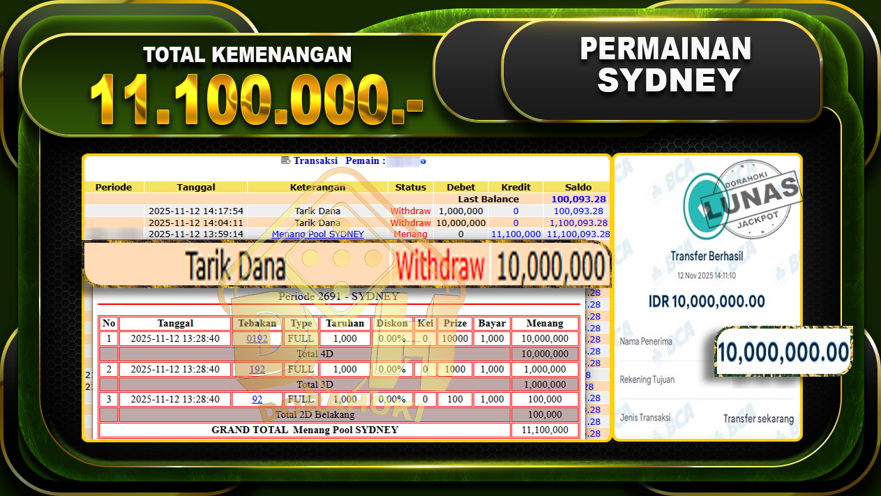 Bukti JP TOGEL SYDNEY – ucapkan selamat kepada user id alexxx atas kemenangan di TOGEL SYDNEY dengan total kemenangan Rp.11,100,000,- Yang pasti nya langsung LUNAS sesuai bukti ya bosku. Dorahoki nih bosku berapapun akan tetap kami bayar lunas ya bosku