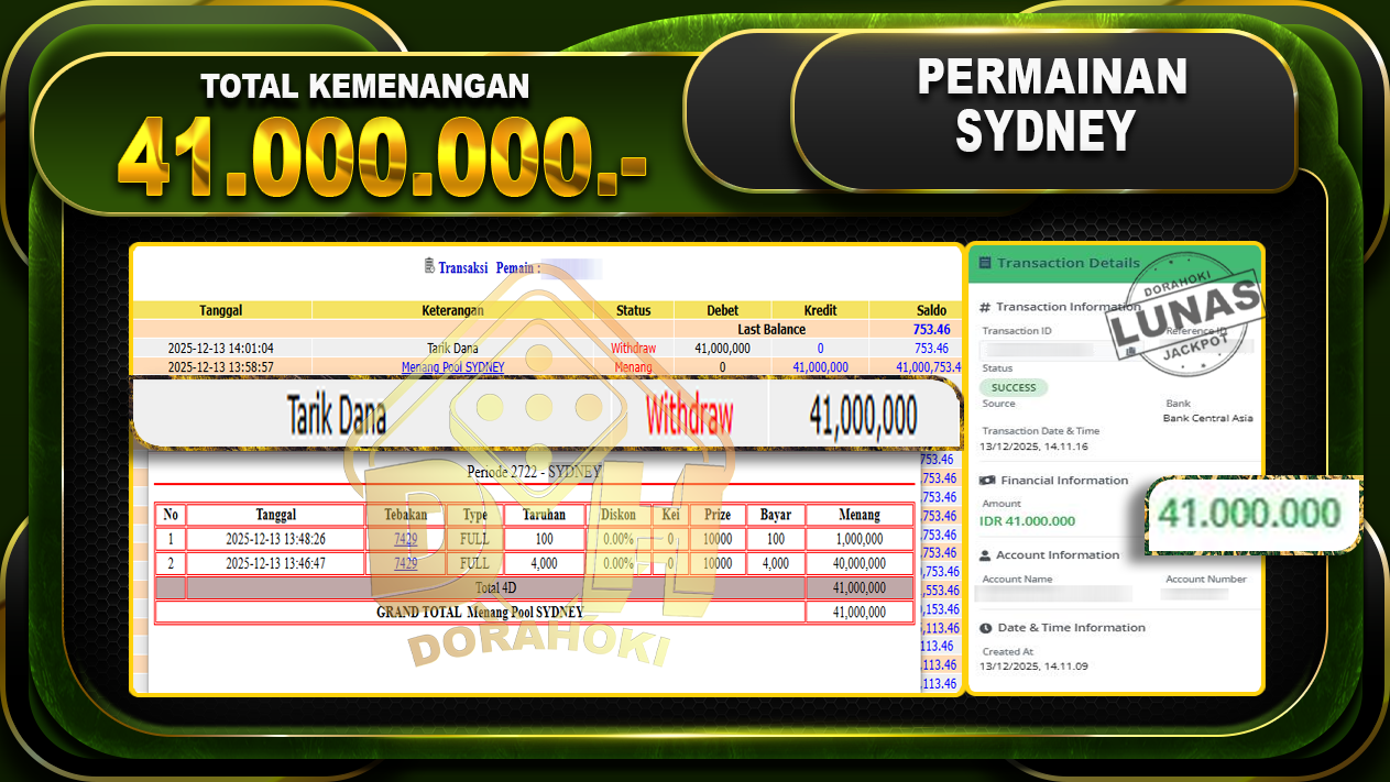 Bukti JP TOGEL SYDNEY – ucapkan selamat kepada user id sunxxxx atas kemenangan di TOGEL SYDNEY dengan total kemenangan Rp.41,000,000,- Yang pasti nya langsung LUNAS sesuai bukti ya bosku. Dorahoki nih bosku berapapun akan tetap kami bayar lunas ya bosku