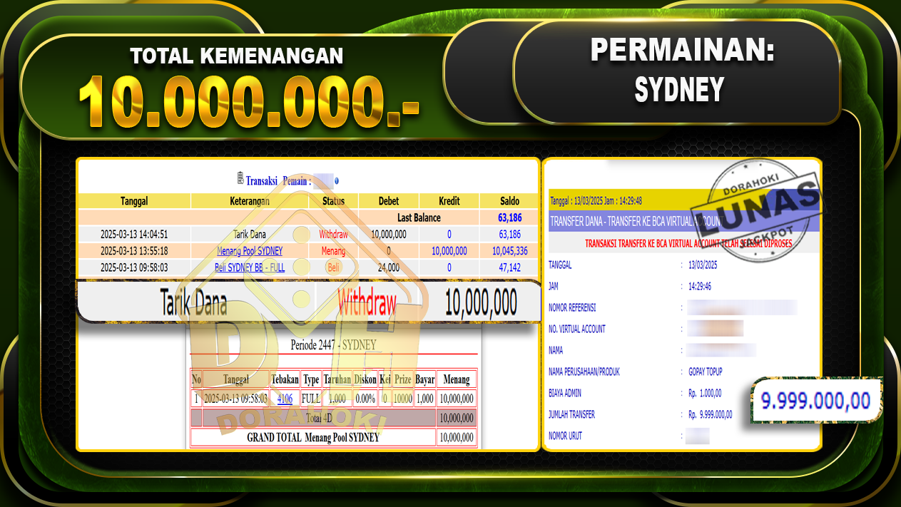 Bukti JP TOGEL SYDNEY – ucapkan selamat kepada user id cilxxx atas kemenangan di TOGEL SYDNEY dengan total kemenangan Rp.10.000.000,- . Yang pasti nya langsung LUNAS sesuai bukti ya bosku. Dorahoki nih bosku berapapun akan tetap kami bayar lunas ya bosku.