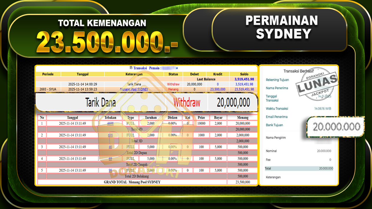 Bukti JP TOGEL SYDNEY – ucapkan selamat kepada user id henxxxxx atas kemenangan di TOGEL SYDNEY dengan total kemenangan Rp.23,500,000,- Yang pasti nya langsung LUNAS sesuai bukti ya bosku. Dorahoki nih bosku berapapun akan tetap kami bayar lunas ya bosku