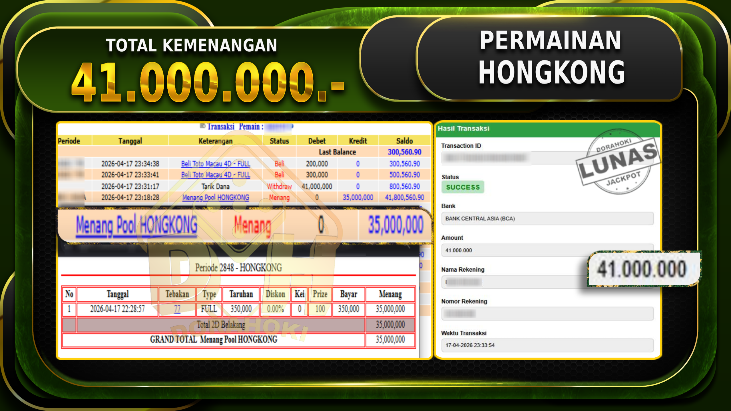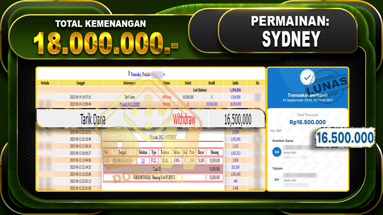 Bukti JP TOGEL SYDNEY – ucapkan selamat kepada user id Dorxxxxxx atas kemenangan di TOGEL SYDNEY dengan total kemenangan Rp.18,00,000,- Yang pasti nya langsung LUNAS sesuai bukti ya bosku. Dorahoki nih bosku berapapun akan tetap kami bayar lunas ya bosku