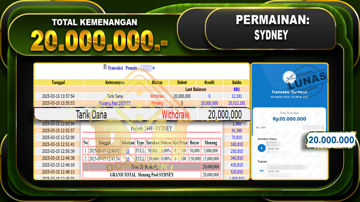 Bukti JP TOGEL SYDNEY – ucapkan selamat kepada user id Wotxxx atas kemenangan di TOGEL SYDNEY dengan total kemenangan Rp.20.000.000,- . Yang pasti nya langsung LUNAS sesuai bukti ya bosku. Dorahoki nih bosku berapapun akan tetap kami bayar lunas ya bosku.