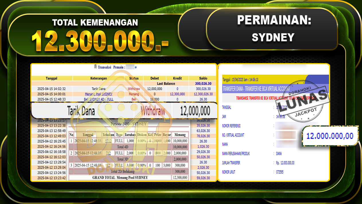 Bukti JP TOGEL SYDNEY – ucapkan selamat kepada user id Lalxxx atas kemenangan di  TOGEL SYDNEY  dengan total kemenangan Rp.12.300.000,- . Yang pasti nya langsung LUNAS sesuai bukti ya bosku. Dorahoki nih bosku berapapun akan tetap kami bayar lunas ya bosku.