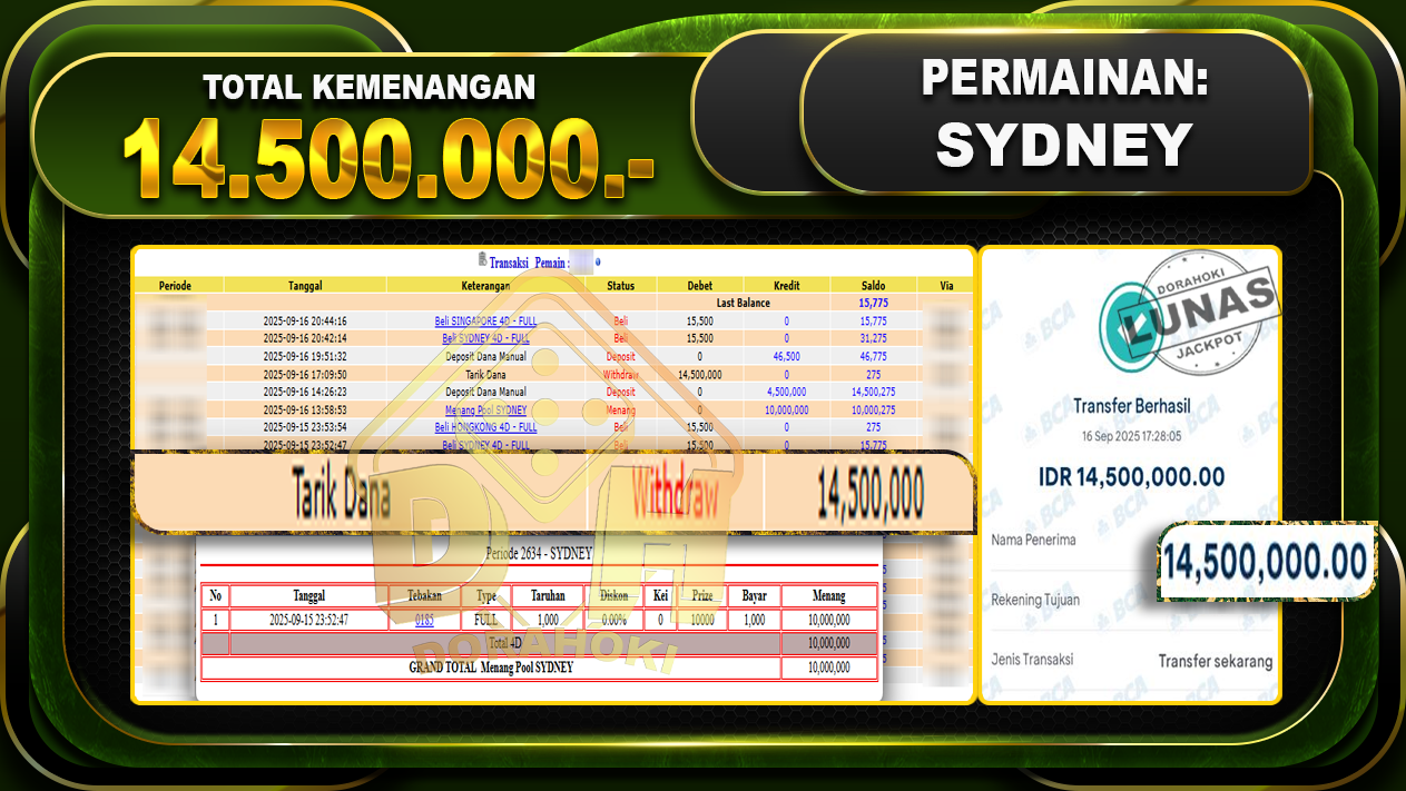 Bukti JP TOGEL SYDNEY – ucapkan selamat kepada user id J4hxxxxx atas kemenangan di TOGEL SYDNEY dengan total kemenangan Rp.14,500,000,- Yang pasti nya langsung LUNAS sesuai bukti ya bosku. Dorahoki nih bosku berapapun akan tetap kami bayar lunas ya bosku