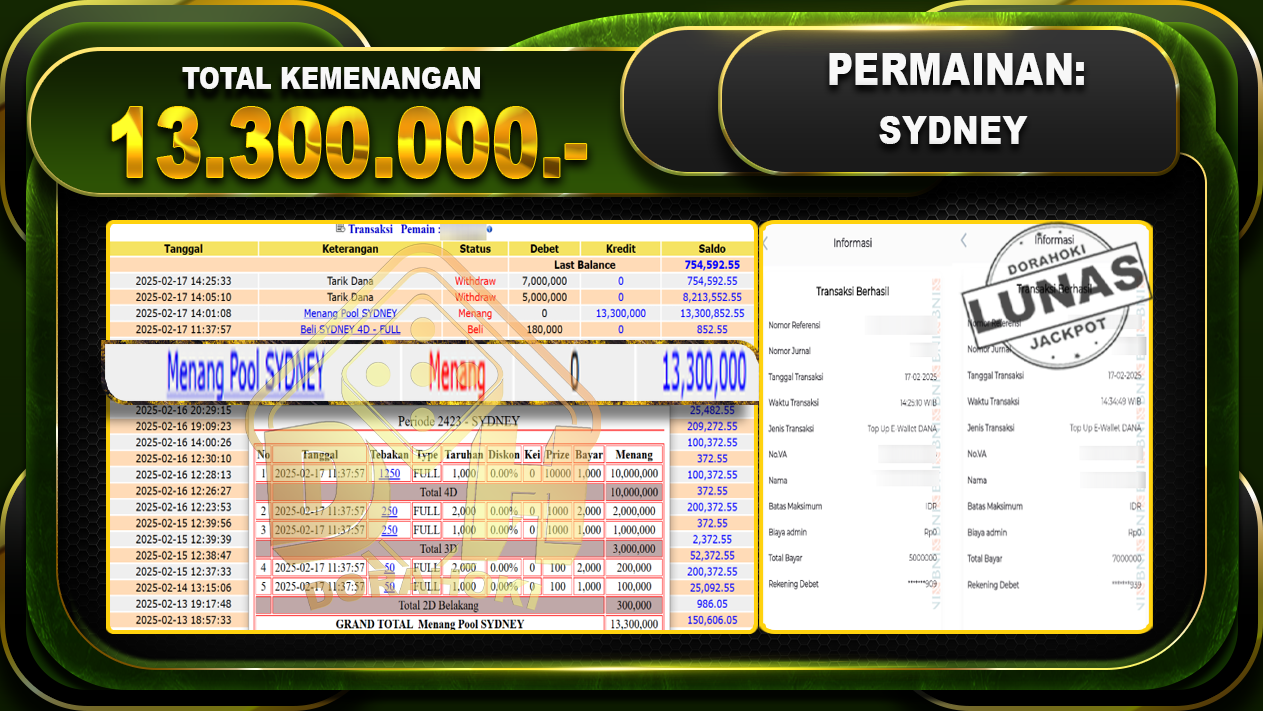 Bukti JP TOGEL SYDNEY – ucapkan selamat kepada user id JOJONxxx atas kemenangan di TOGEL SYDNEY dengan total kemenangan Rp.13.300.000,- . Yang pasti nya langsung LUNAS sesuai bukti ya bosku. Dorahoki nih bosku berapapun akan tetap kami bayar lunas ya bosku.