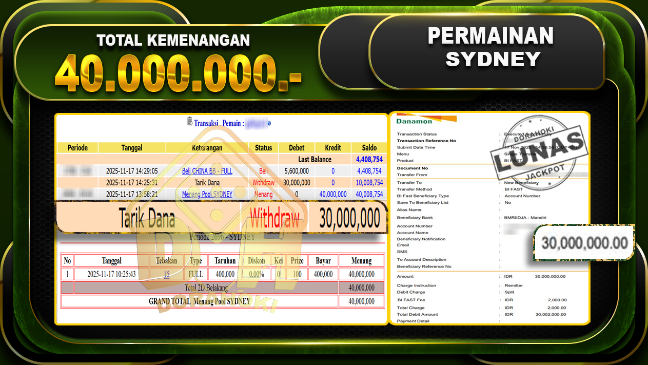 Bukti JP TOGEL SYDNEY – ucapkan selamat kepada user id gulxxxxx atas kemenangan di TOGEL SYDNEY dengan total kemenangan Rp.40,000,000,- Yang pasti nya langsung LUNAS sesuai bukti ya bosku. Dorahoki nih bosku berapapun akan tetap kami bayar lunas ya bosku