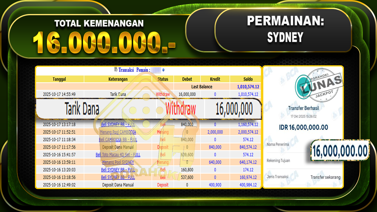 Bukti JP TOGEL SYDNEY – ucapkan selamat kepada user id yatxxxxx atas kemenangan di TOGEL SYDNEY dengan total kemenangan Rp.16,000,000,- Yang pasti nya langsung LUNAS sesuai bukti ya bosku. Dorahoki nih bosku berapapun akan tetap kami bayar lunas ya bosku
