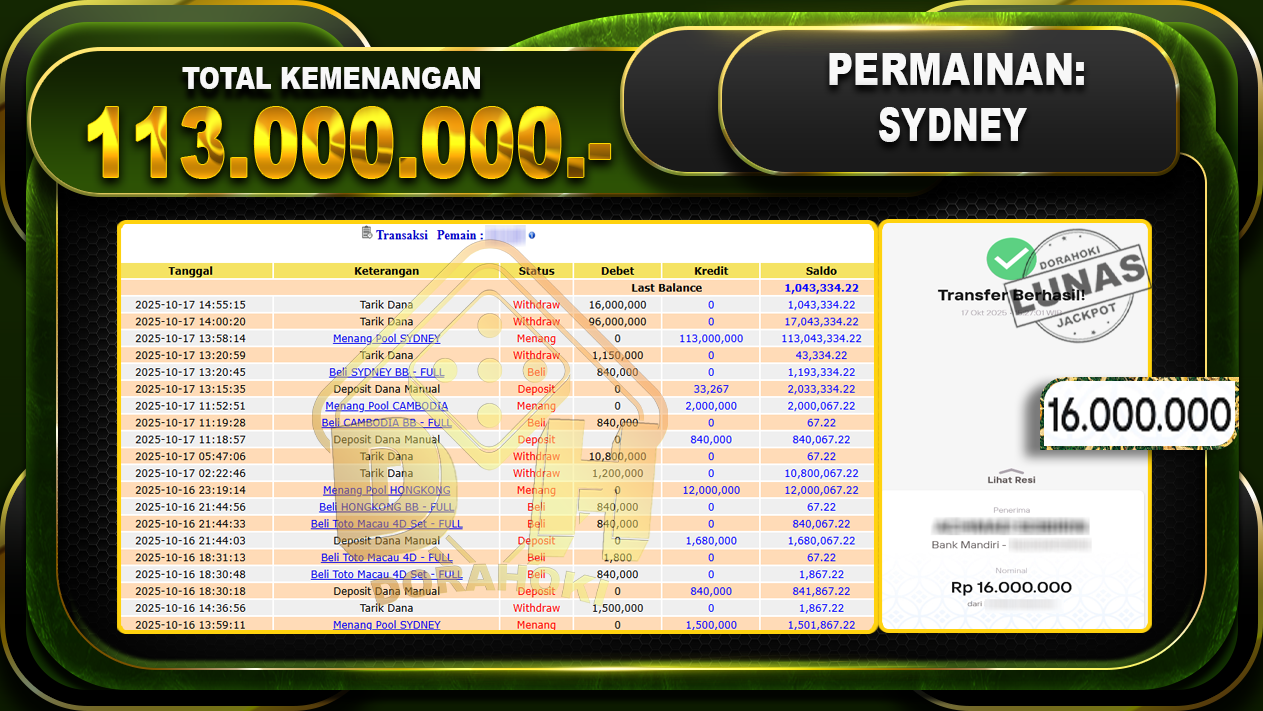 Bukti JP TOGEL SYDNEY – ucapkan selamat kepada user id harxxx atas kemenangan di  TOGEL SYDNEY dengan total kemenangan Rp.113,000,000,- Yang pasti nya langsung LUNAS sesuai bukti ya bosku. Dorahoki nih bosku berapapun akan tetap kami bayar lunas ya bosku