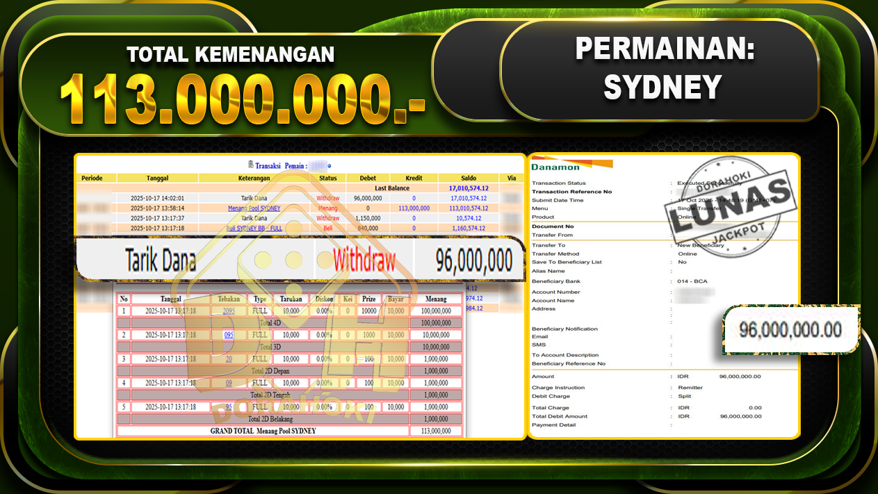 Bukti JP TOGEL SYDNEY – ucapkan selamat kepada user id yatxxxx atas kemenangan di  TOGEL SYDNEY dengan total kemenangan Rp.113,000,000,- Yang pasti nya langsung LUNAS sesuai bukti ya bosku. Dorahoki nih bosku berapapun akan tetap kami bayar lunas ya bosku