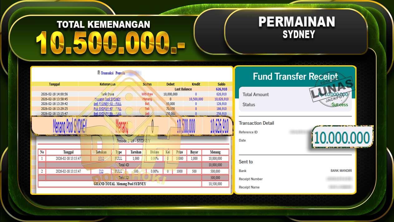 Bukti JP TOGEL SYDNEY – Selamat Kepada User ID : Caixxx atas kemenangan TOGEL SYDNEY  Dengan Nominal Sebesar Rp 10.500.000,- . Yang pasti nya langsung LUNAS Sesuai Bukti.