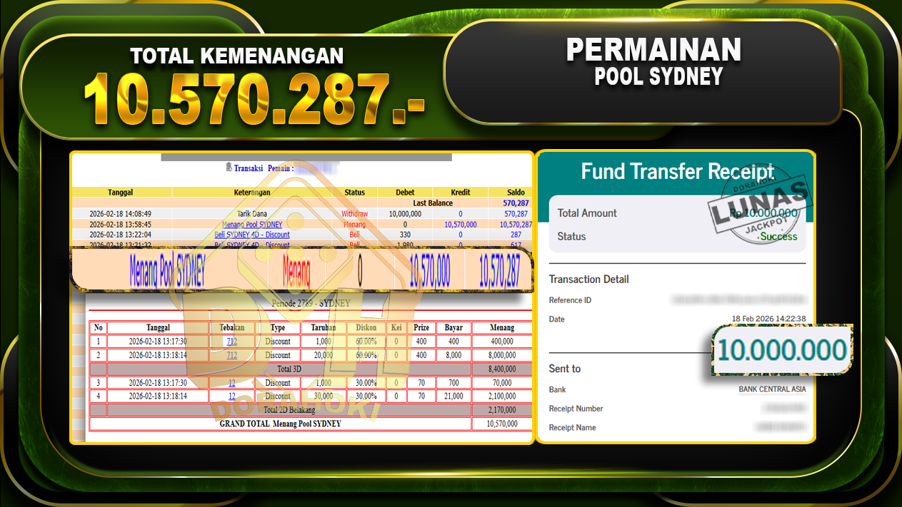 Bukti JP TOGEL SYDNEY – Selamat Kepada User ID : Lanxxx atas kemenangan TOGEL SYDNEY Dengan Nominal Sebesar Rp 10.570.287,- . Yang pasti nya langsung LUNAS Sesuai Bukti.