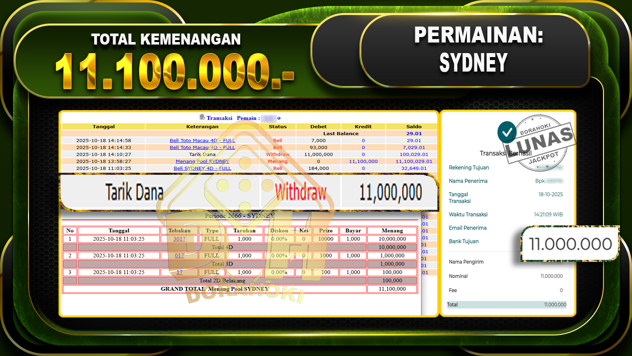 Bukti JP TOGEL SYDNEY – ucapkan selamat kepada user id mtxxx atas kemenangan di TOGEL SYDNEY dengan total kemenangan Rp.11,100,000,- Yang pasti nya langsung LUNAS sesuai bukti ya bosku. Dorahoki nih bosku berapapun akan tetap kami bayar lunas ya bosku