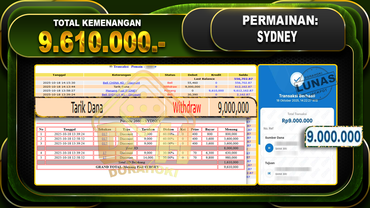 Bukti JP TOGEL SYDNEY – ucapkan selamat kepada user id aixxx atas kemenangan di TOGEL SYDNEY dengan total kemenangan Rp.9,610,000,- Yang pasti nya langsung LUNAS sesuai bukti ya bosku. Dorahoki nih bosku berapapun akan tetap kami bayar lunas ya bosku