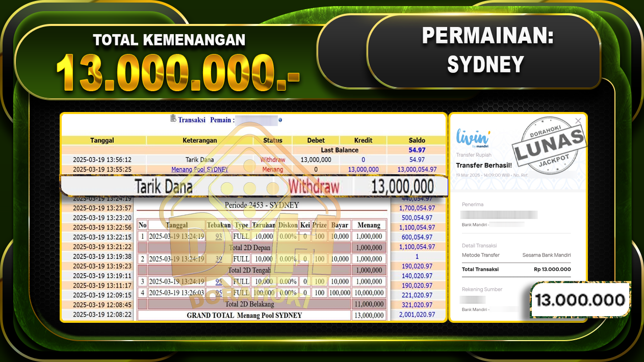 Bukti JP TOGEL SYDNEY – ucapkan selamat kepada user id Budxxx atas kemenangan di  TOGEL SYDNEY  dengan total kemenangan Rp.13.000.000,- . Yang pasti nya langsung LUNAS sesuai bukti ya bosku. Dorahoki nih bosku berapapun akan tetap kami bayar lunas ya bosku.