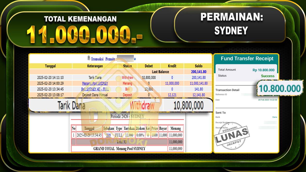 Bukti JP TOGEL SYDNEY – ucapkan selamat kepada user id barondolxxx atas kemenangan di  TOGEL SYDNEY  dengan total kemenangan Rp.11.000.000,- . Yang pasti nya langsung LUNAS sesuai bukti ya bosku. Dorahoki nih bosku berapapun akan tetap kami bayar lunas ya bosku.