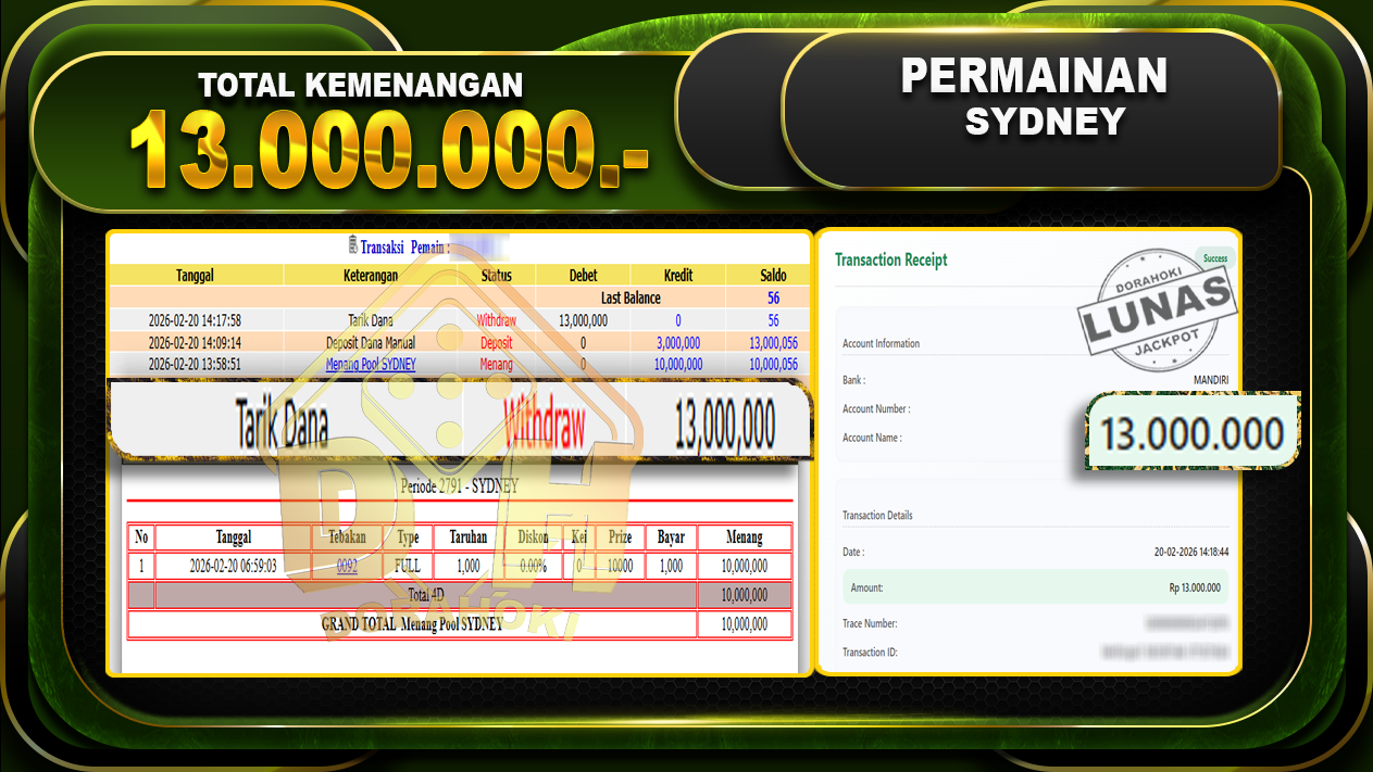 Bukti JP TOGEL SYDNEY – Selamat Kepada User ID : Ifaxxx atas kemenangan TOGEL SYDNEY  Dengan Nominal Sebesar Rp 13.000.000,- . Yang pasti nya langsung LUNAS Sesuai Bukti.