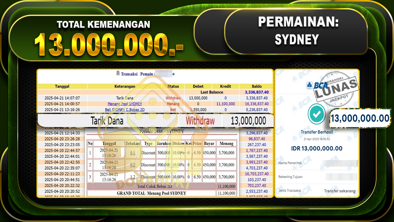 Bukti JP TOGEL SYDNEY – ucapkan selamat kepada user id Hafxxx atas kemenangan di  TOGEL SYDNEY  dengan total kemenangan Rp.13.000.000,- . Yang pasti nya langsung LUNAS sesuai bukti ya bosku. Dorahoki nih bosku berapapun akan tetap kami bayar lunas ya bosku.