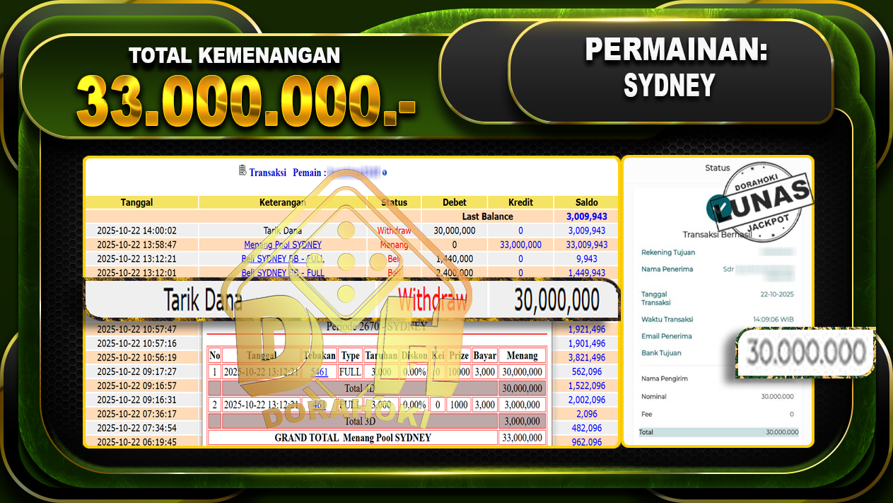 Bukti JP TOGEL SYDNEY – ucapkan selamat kepada user id kamxxxxx atas kemenangan di TOGEL SYDNEY dengan total kemenangan Rp.33,000,000,- Yang pasti nya langsung LUNAS sesuai bukti ya bosku. Dorahoki nih bosku berapapun akan tetap kami bayar lunas ya bosku