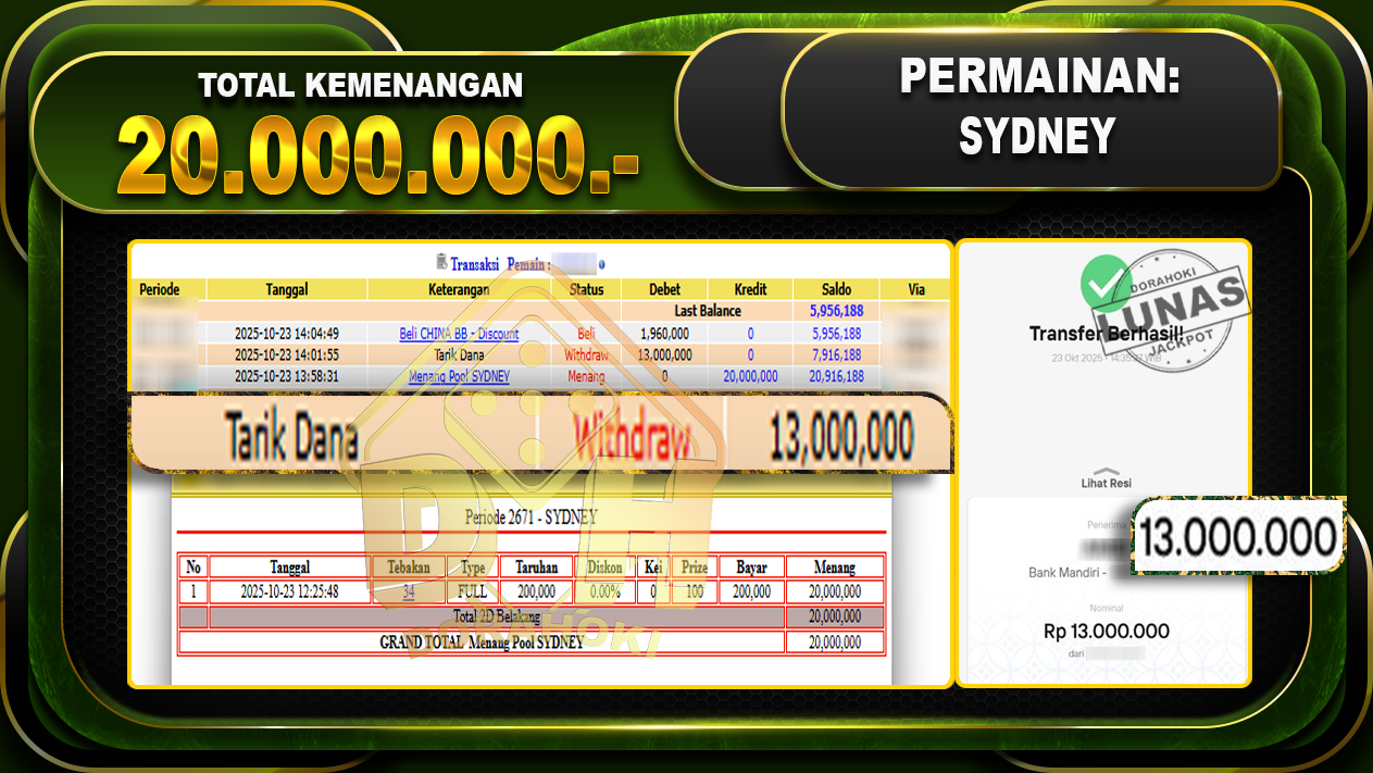 Bukti JP TOGEL SYDNEY – ucapkan selamat kepada user id gulxxxx atas kemenangan di TOGEL SYDNEY dengan total kemenangan Rp.20,000,000,- Yang pasti nya langsung LUNAS sesuai bukti ya bosku. Dorahoki nih bosku berapapun akan tetap kami bayar lunas ya bosku