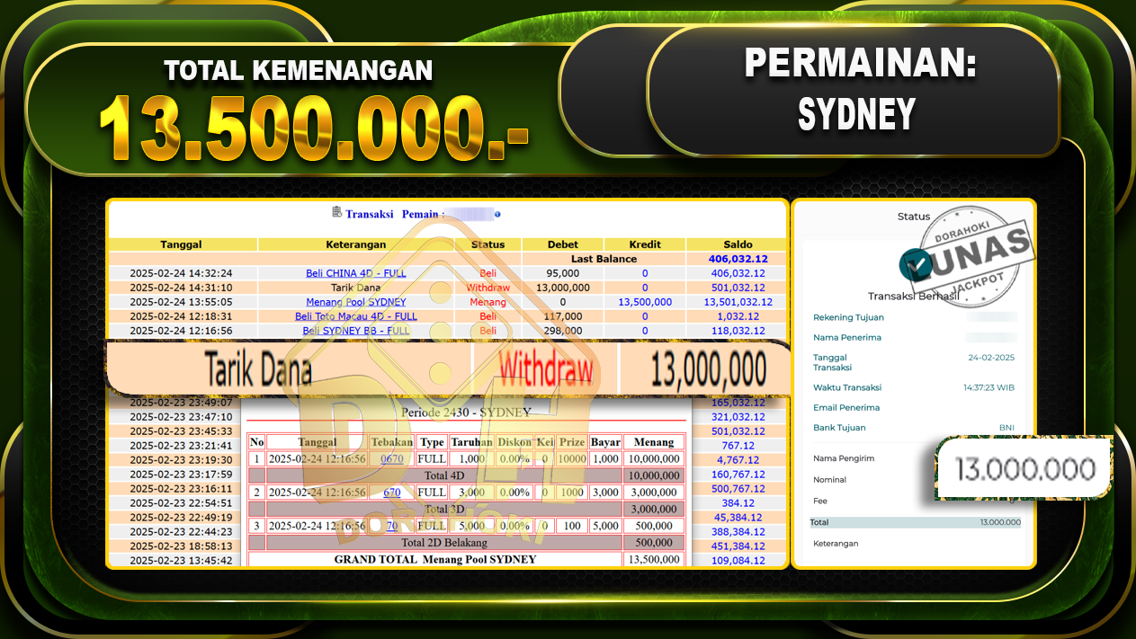 Bukti JP TOGEL SYDNEY – ucapkan selamat kepada user id sanxxx atas kemenangan di TOGEL SYDNEY dengan total kemenangan Rp.13.500.000,- . Yang pasti nya langsung LUNAS sesuai bukti ya bosku. Dorahoki nih bosku berapapun akan tetap kami bayar lunas ya bosku.