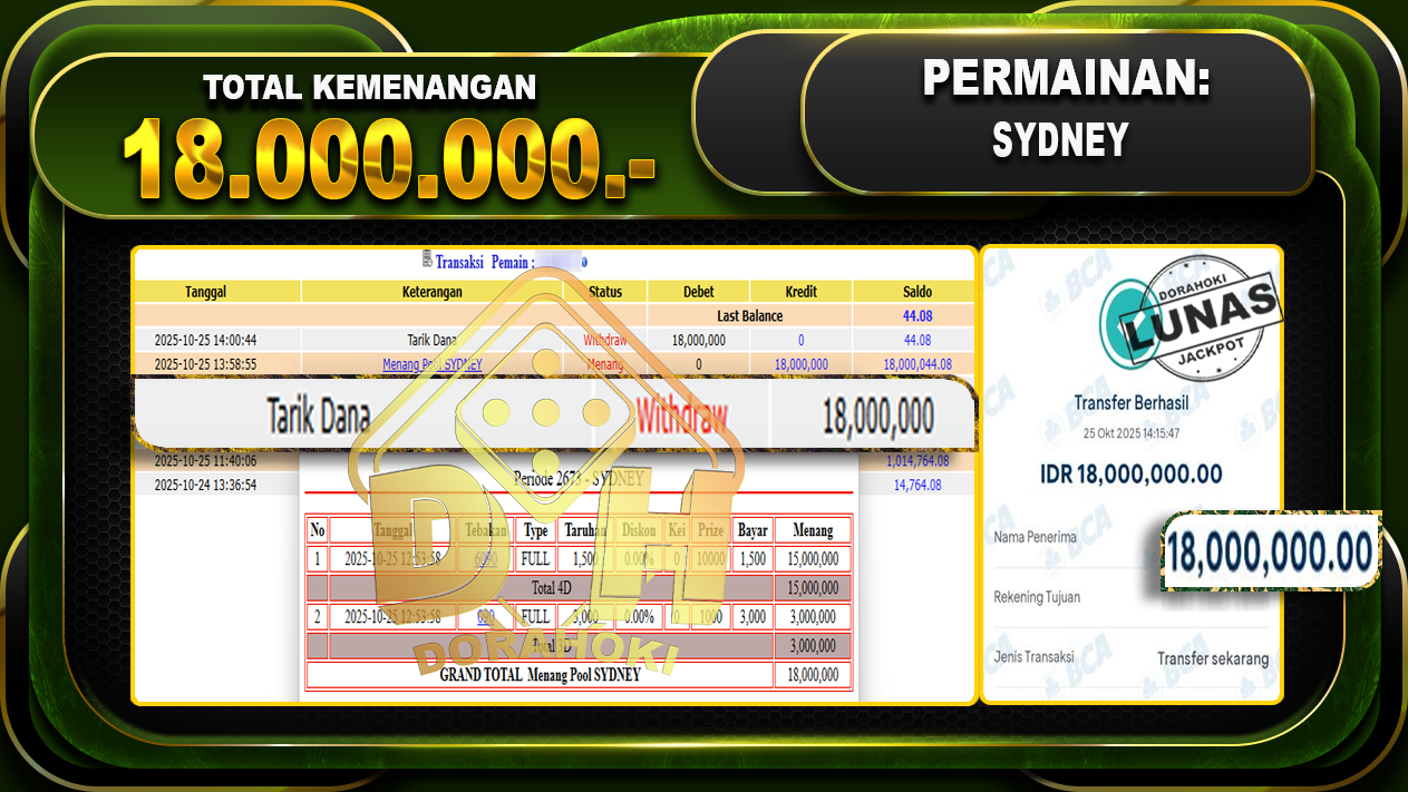 Bukti JP TOGEL SYDNEY – ucapkan selamat kepada user id capxxx atas kemenangan di TOGEL SYDNEY dengan total kemenangan Rp.18,000,000,- Yang pasti nya langsung LUNAS sesuai bukti ya bosku. Dorahoki nih bosku berapapun akan tetap kami bayar lunas ya bosku
