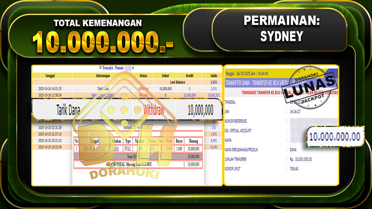 Bukti JP TOGEL SYDNEY – ucapkan selamat kepada user id jaxxxx atas kemenangan di TOGEL SYDNEY dengan total kemenangan Rp.10,000,000,- Yang pasti nya langsung LUNAS sesuai bukti ya bosku. Dorahoki nih bosku berapapun akan tetap kami bayar lunas ya bosku