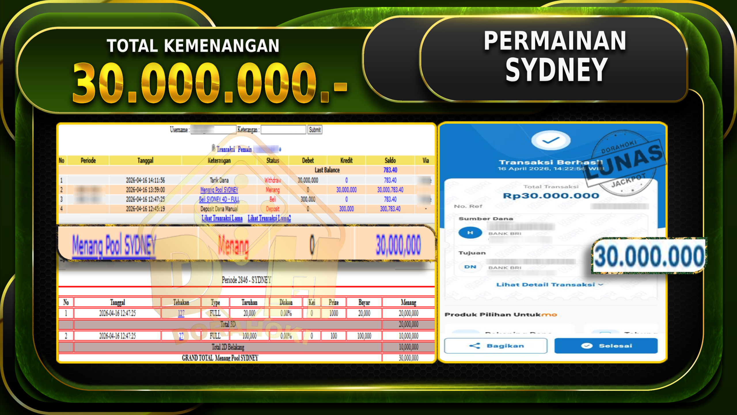 Bukti JP TOGEL SYDNEY – ucapkan selamat kepada user id marxxx atas kemenangan di TOGEL SYDNEY dengan total kemenangan Rp 44.400.000,- . Yang pasti nya langsung LUNAS sesuai bukti ya bosku. Dorahoki nih bosku berapapun akan tetap kami bayar lunas ya bosku.