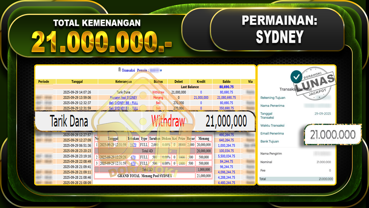 Bukti JP TOGEL SYDNEY – ucapkan selamat kepada user id detxxxx atas kemenangan di  TOGEL SYDNEY dengan total kemenangan Rp.21,000,000,- Yang pasti nya langsung LUNAS sesuai bukti ya bosku. Dorahoki nih bosku berapapun akan tetap kami bayar lunas ya bosku