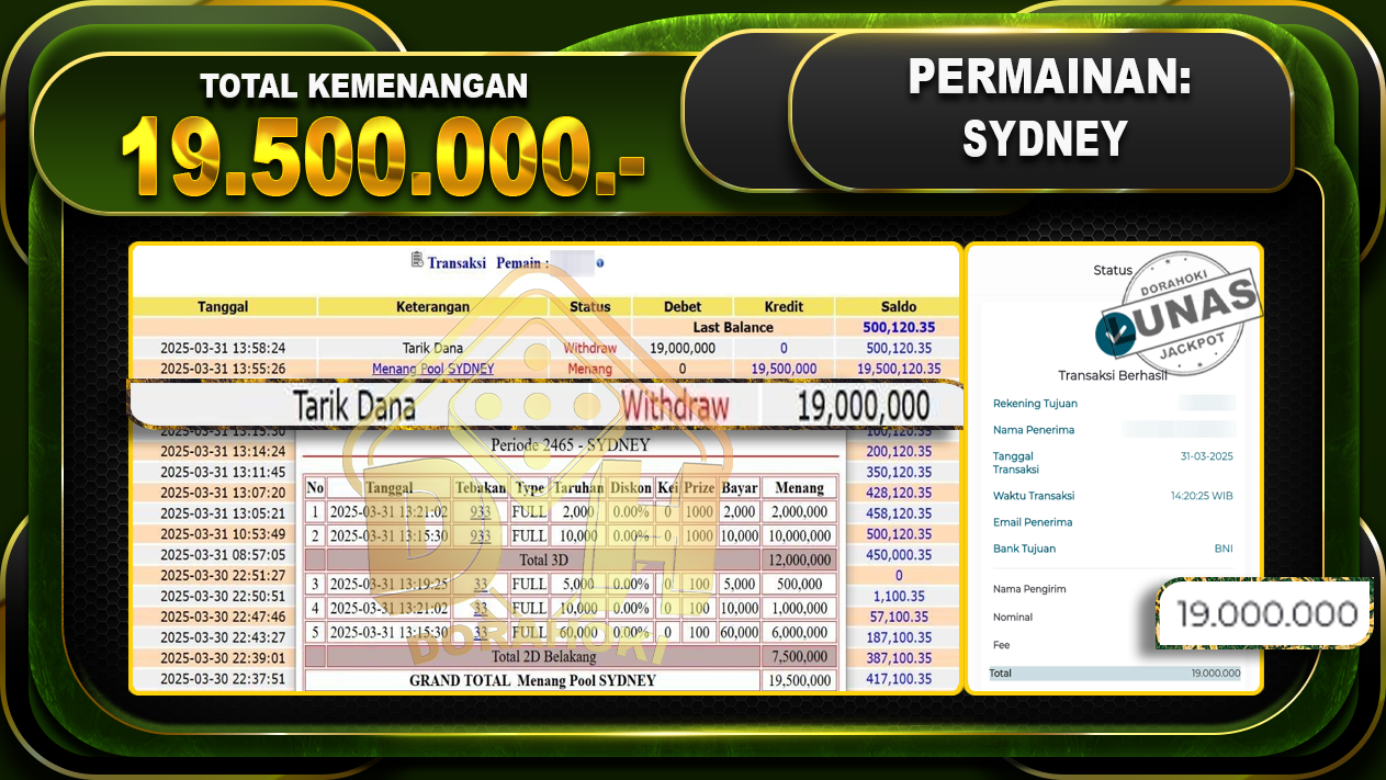 Bukti JP TOGEL SYDNEY – ucapkan selamat kepada user id Jayxxx atas kemenangan di  TOGEL SYDNEY  dengan total kemenangan Rp.19.500.000,- . Yang pasti nya langsung LUNAS sesuai bukti ya bosku. Dorahoki nih bosku berapapun akan tetap kami bayar lunas ya bosku.