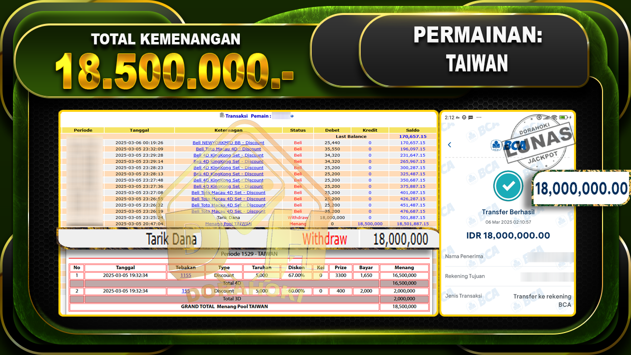 Bukti JP TOGEL TAIWAN- ucapkan selamat kepada user id Tunxxx atas kemenangan di TOGEL TAIWAN dengan total kemenangan Rp.18.500.000,- . Yang pasti nya langsung LUNAS sesuai bukti ya bosku. Dorahoki nih bosku berapapun akan tetap kami bayar lunas ya bosku.