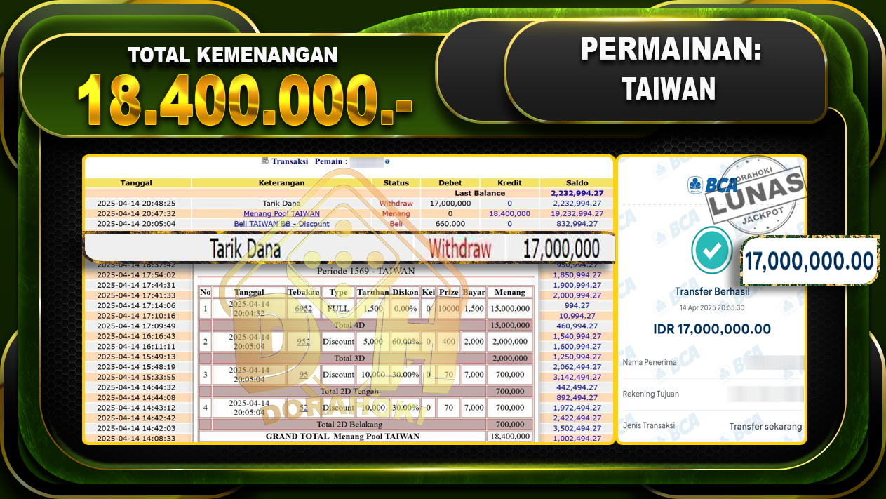 Bukti JP TOGEL TAIWAN- ucapkan selamat kepada user id Lapxxx atas kemenangan di TOGEL TAIWAN dengan total kemenangan Rp.18.400.000,- . Yang pasti nya langsung LUNAS sesuai bukti ya bosku. Dorahoki nih bosku berapapun akan tetap kami bayar lunas ya bosku.