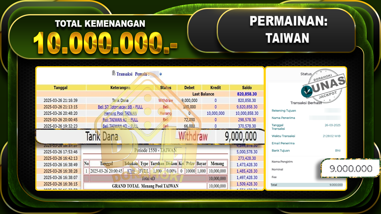 Bukti JP TOGEL TAIWAN- ucapkan selamat kepada user id Lapxxx atas kemenangan di TOGEL TAIWAN dengan total kemenangan Rp.10.000.000,- . Yang pasti nya langsung LUNAS sesuai bukti ya bosku. Dorahoki nih bosku berapapun akan tetap kami bayar lunas ya bosku.