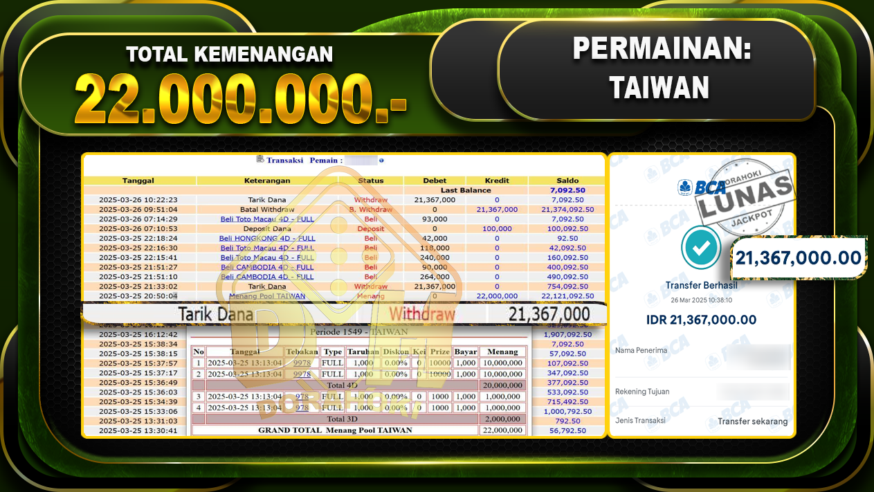 Bukti JP TOGEL TAIWAN- ucapkan selamat kepada user id Tosxxx atas kemenangan di TOGEL TAIWAN dengan total kemenangan Rp.22.000.000,- . Yang pasti nya langsung LUNAS sesuai bukti ya bosku. Dorahoki nih bosku berapapun akan tetap kami bayar lunas ya bosku.
