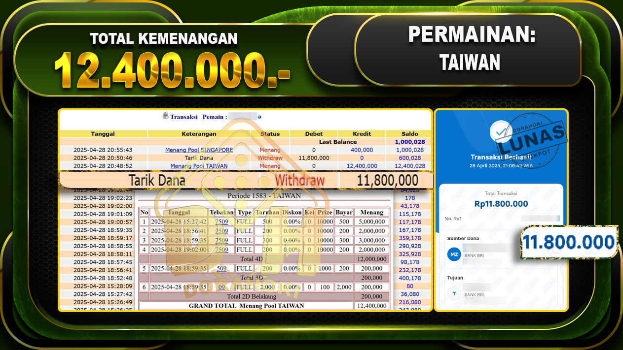 Bukti JP TOGEL TAIWAN- ucapkan selamat kepada user id Babxxx atas kemenangan di TOGEL TAIWAN dengan total kemenangan Rp.12.400.000,- . Yang pasti nya langsung LUNAS sesuai bukti ya bosku. Dorahoki nih bosku berapapun akan tetap kami bayar lunas ya bosku.