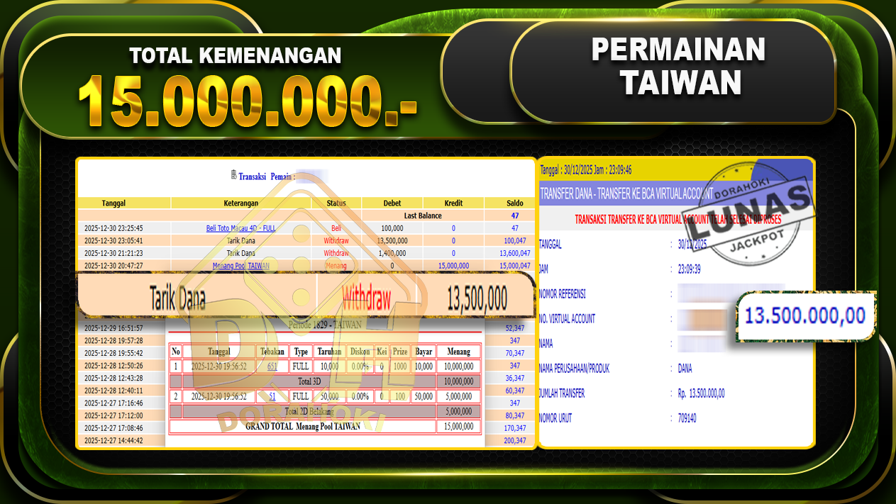 Bukti JP TOGEL TAIWAN – ucapkan selamat kepada user id dekxxx atas kemenangan di TOGEL TAIWAN dengan total kemenangan Rp.15.000.000,- Yang pasti nya langsung LUNAS sesuai bukti ya bosku. Dorahoki nih bosku berapapun akan tetap kami bayar lunas ya bosku