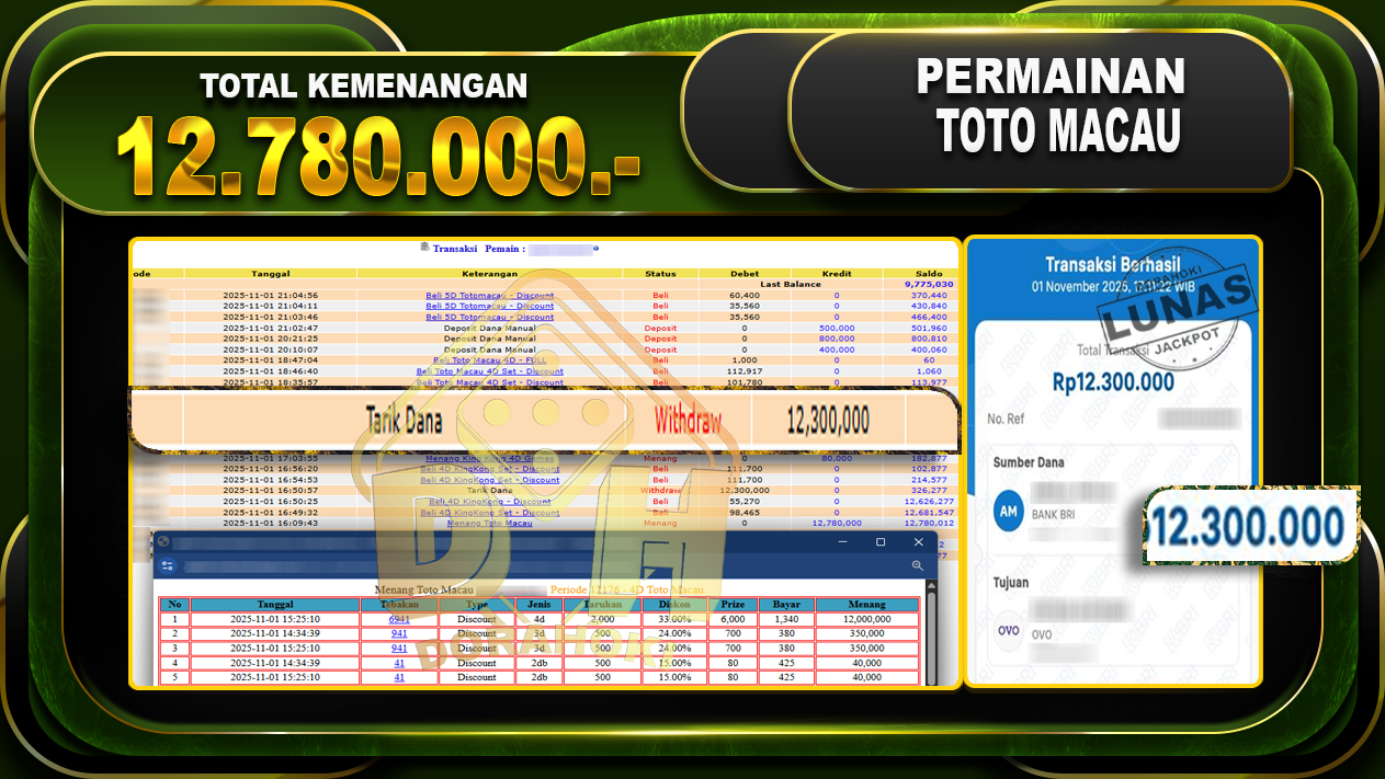 Bukti JP TOGEL TOTO MACAU 4D – ucapkan selamat kepada user id pepxxxxx atas kemenangan di TOGEL TOTO MACAU 4D dengan total kemenangan Rp.12,780,000,- Yang pasti nya langsung LUNAS sesuai bukti ya bosku. Dorahoki nih bosku berapapun akan tetap kami bayar lunas ya bosku