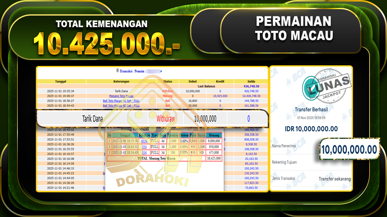 Bukti JP TOGEL TOTO MACAU 4D – ucapkan selamat kepada user id damxxxx atas kemenangan di TOGEL TOTO MACAU 4D dengan total kemenangan Rp.10,425,000,- Yang pasti nya langsung LUNAS sesuai bukti ya bosku. Dorahoki nih bosku berapapun akan tetap kami bayar lunas ya bosku