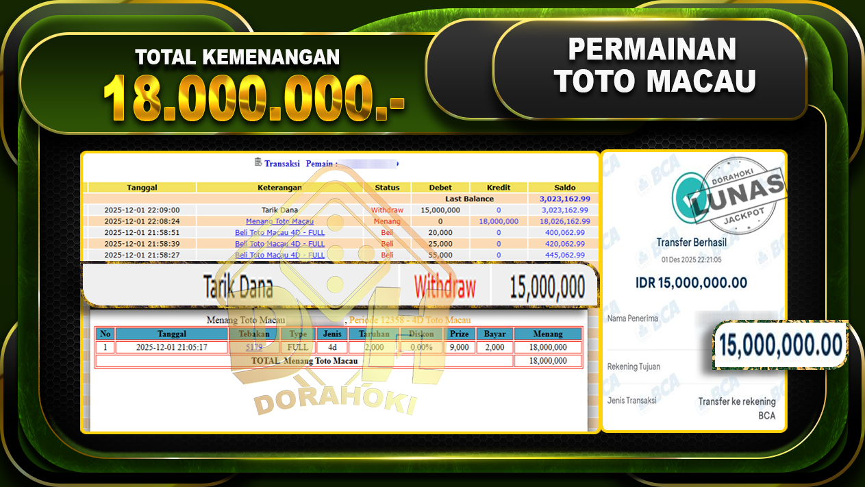 Bukti JP TOGEL TOTO MACAU 4D – ucapkan selamat kepada user id wanxxxxx atas kemenangan di TOGEL TOTO MACAU 4D dengan total kemenangan Rp.18,000,000,- Yang pasti nya langsung LUNAS sesuai bukti ya bosku. Dorahoki nih bosku berapapun akan tetap kami bayar lunas ya bosku