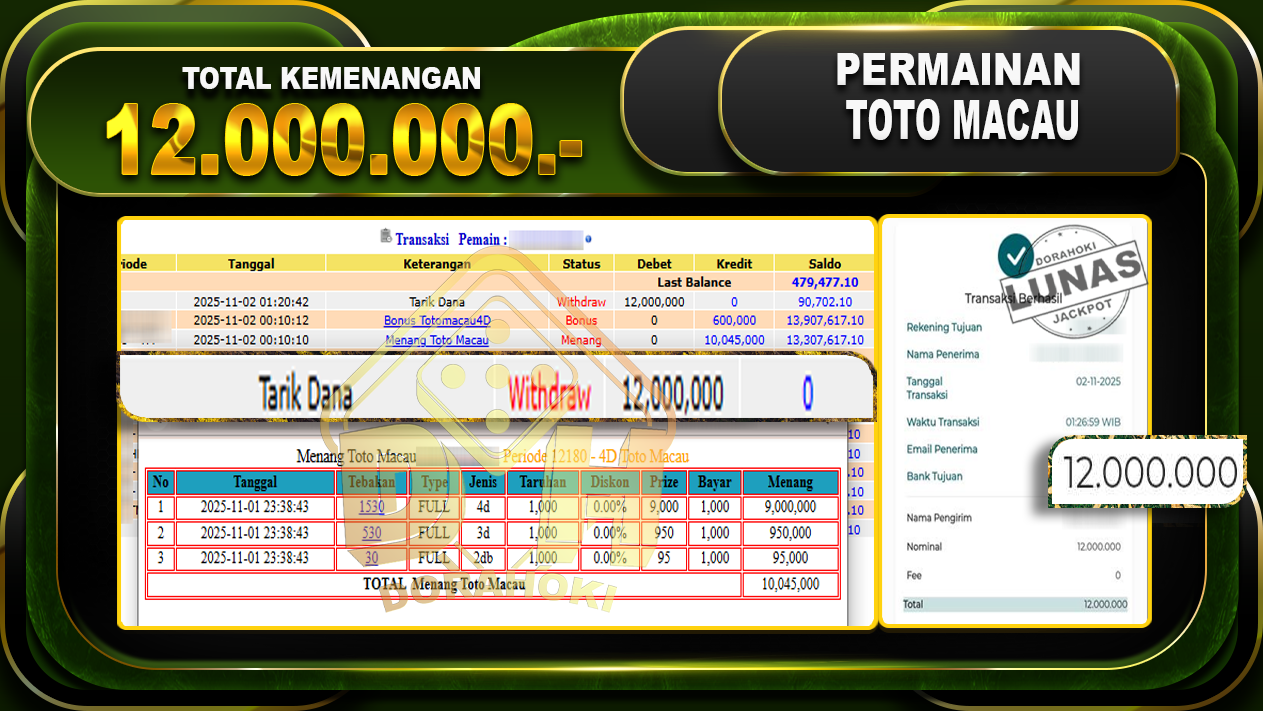 Bukti JP TOGEL TOTO MACAU 4D – ucapkan selamat kepada user id tuaxxxxx atas kemenangan di TOGEL TOTO MACAU 4D dengan total kemenangan Rp.12,000,000,- Yang pasti nya langsung LUNAS sesuai bukti ya bosku. Dorahoki nih bosku berapapun akan tetap kami bayar lunas ya bosku
