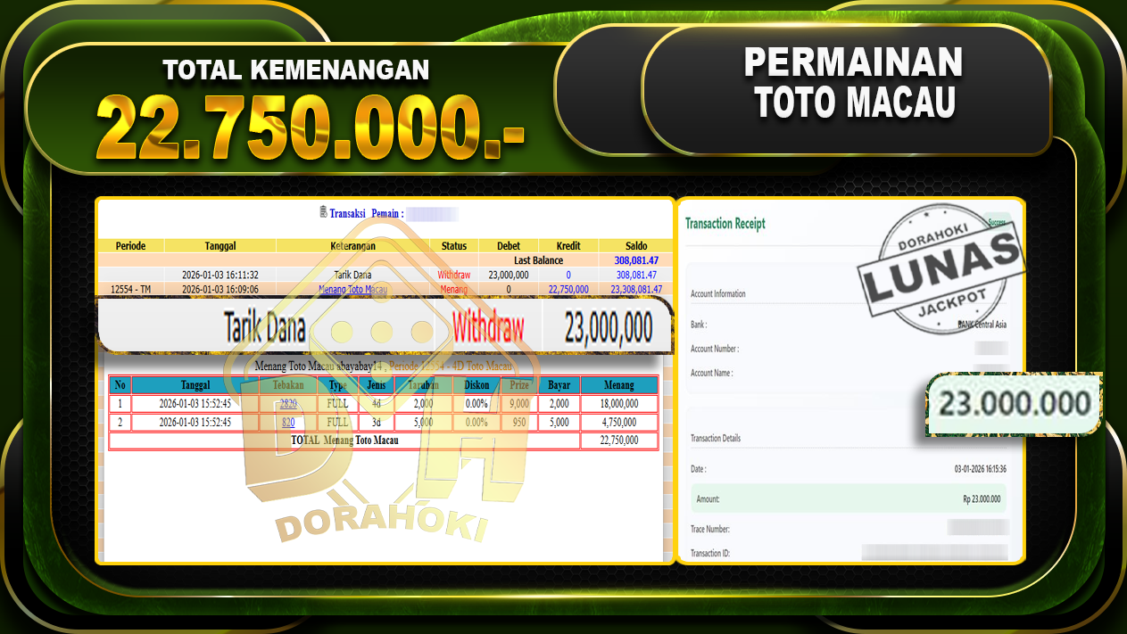Bukti JP TOGEL TOTO MACAU 4D – ucapkan selamat kepada user id abaxxxxx atas kemenangan di TOGEL TOTO MACAU 4D dengan total kemenangan Rp.22.750.000,- Yang pasti nya langsung LUNAS sesuai bukti ya bosku. Dorahoki nih bosku berapapun akan tetap kami bayar lunas ya bosku