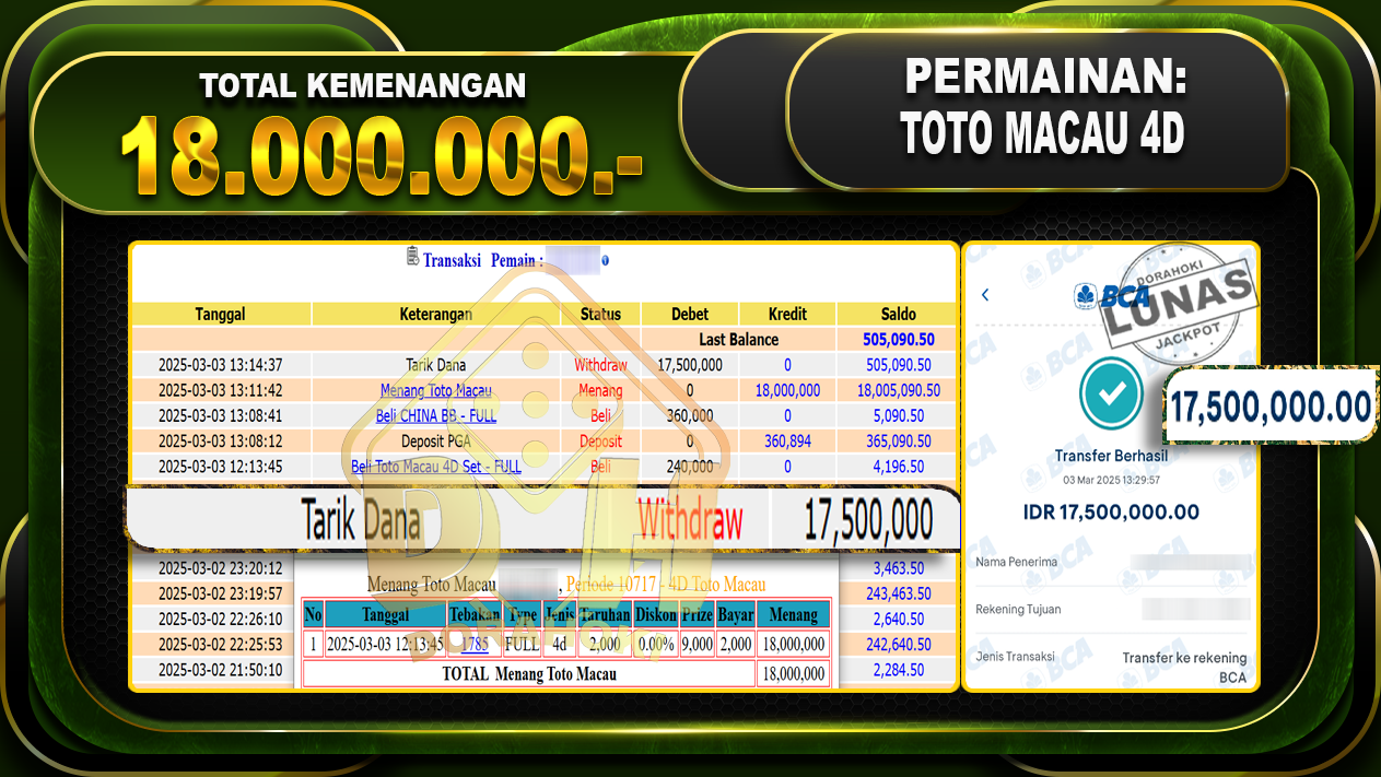 Bukti JP TOGEL TOTO MACAU 4D – ucapkan selamat kepada user id Agoxxx atas kemenangan di TOGEL TOTO MACAU 4D dengan total kemenangan Rp.18.000.000,- . Yang pasti nya langsung LUNAS sesuai bukti ya bosku. Dorahoki nih bosku berapapun akan tetap kami bayar lunas ya bosku.