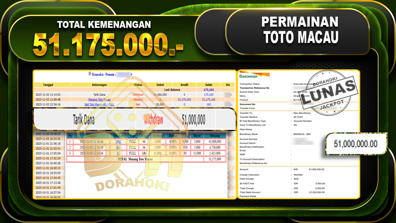 Bukti JP TOGEL TOTO MACAU 4D – ucapkan selamat kepada user id indxxxxx atas kemenangan di TOGEL TOTO MACAU 4D dengan total kemenangan Rp.51,175,000,- Yang pasti nya langsung LUNAS sesuai bukti ya bosku. Dorahoki nih bosku berapapun akan tetap kami bayar lunas ya bosku