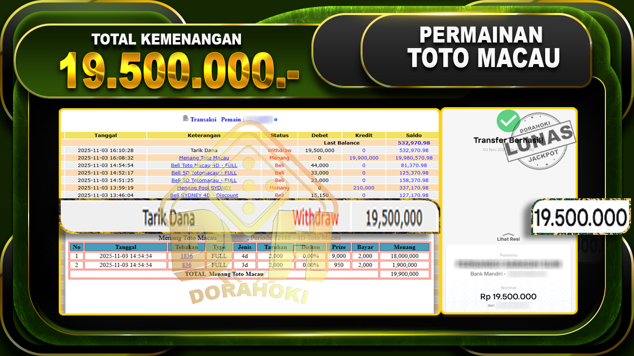 Bukti JP TOGEL TOTO MACAU 4D – ucapkan selamat kepada user id sarxxxxx atas kemenangan di TOGEL TOTO MACAU 4D dengan total kemenangan Rp.19,500,000,- Yang pasti nya langsung LUNAS sesuai bukti ya bosku. Dorahoki nih bosku berapapun akan tetap kami bayar lunas ya bosku